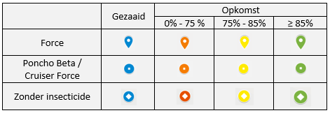– D+xx = Waarnemingen xx dagen na de zaai; – xx% = xx % opkomst