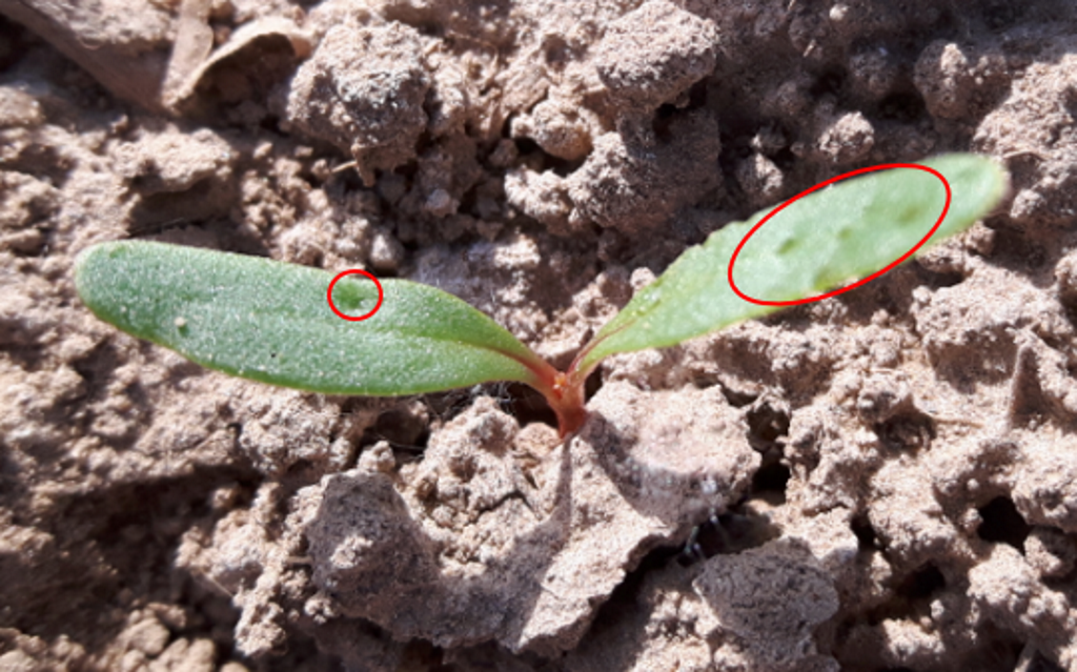 De aanwezigheid van recente vraatplekken, zoals die op de foto hieronder, moet worden gecontroleerd. Wanneer er veel vraatplekken zijn, kunnen ze problemen van selectiviteit veroorzaken. Controleer uw percelen voordat u uw FAR-behandeling uitvoert. Normaal gesproken zou het zachtere en nattere weer van de komende dagen de activiteit van de aardvlooien moeten beperken.