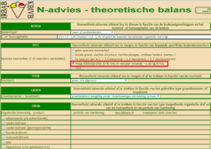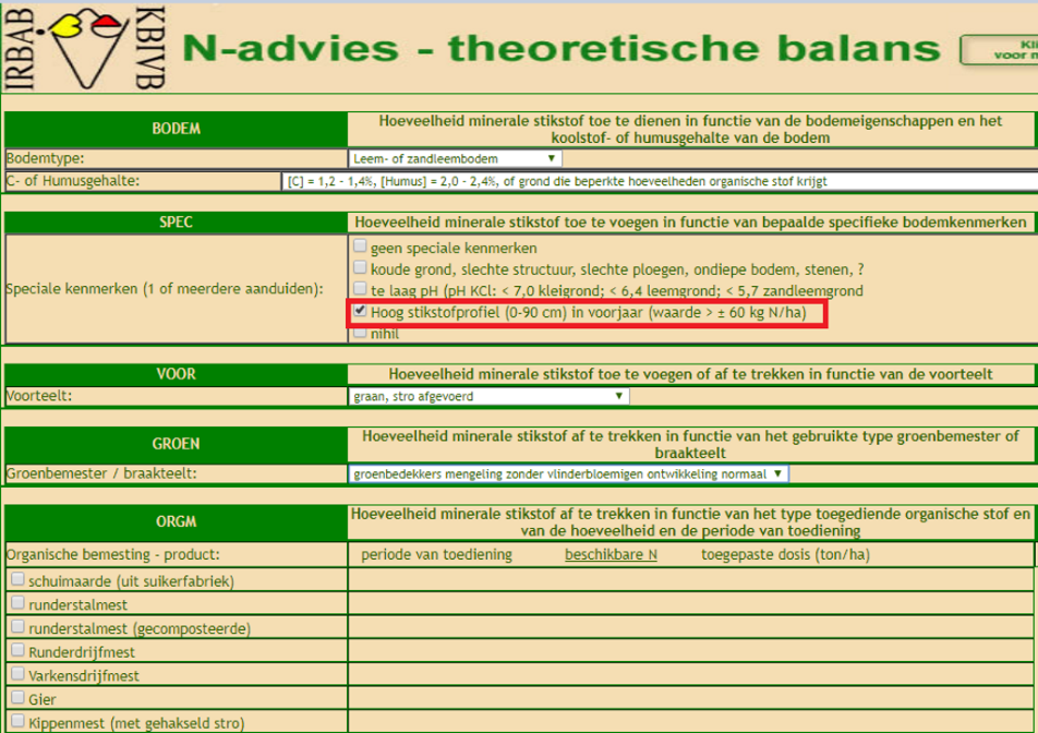 Als u op uw landbouwbedrijf profielen heeft gemaakt en deze profielen hebben een N-gehalte van meer dan 60 kgN/ha, heeft u de mogelijkheid om tijdens deze berekening “hoog stikstofprofiel in het voorjaar” aan te vinken in het betreffende bodemoppervlak.