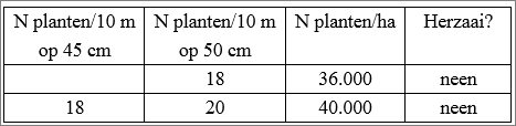 Volledige opkomst aan 80%: op17 cm = 47 planten/10 m; op 18 cm: 44 planten/10 m; op 20 cm: 40 planten/10 m.
