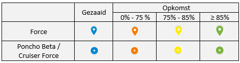 – D+xx = Waarnemingen xx dagen na de zaai; – xx% = xx % opkomst