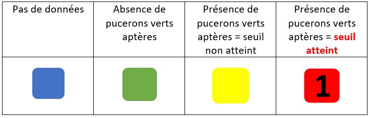 Home » Cartografie waarnemingsvelden » Mei-juni 2019: kaart “waarnemingen groene bladluizen” (bieten) » Légende mai juin