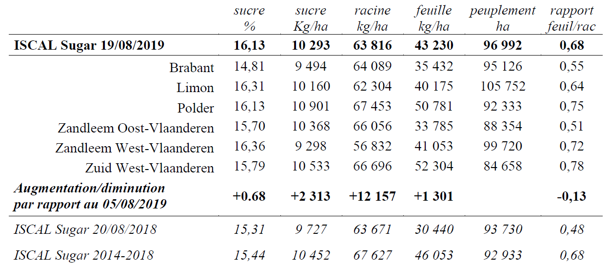 La betterave est caractérisée par une richesse en augmentation par rapport au premier prélèvement et supérieur à la richesse moyenne des cinq dernières années. Le rendement sucre est supérieur à celui en 2018 mais légèrement inférieur à la moyenne de cinq ans. L’augmentation de rendement est de 165 kg de sucre par jour. Les moyennes cachent cependant des disparités régionales et entre parcelles parfois très importantes.