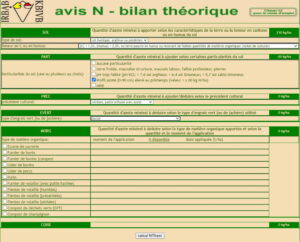 Ce module permet de situer un niveau de fumure azotée selon des valeurs standards, sans recourir nécessairement à une analyse de profil. Il tient compte de la teneur en humus du sol et de la valeur fertilisante des matières organiques les plus courantes, selon le moment d’application et les quantités utilisées. De nombreux essais de l’IRBAB ont montré la validité de la dose de fumure azotée établie selon ce modèle.