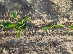 Dans un nombre important de parcelles, des betteraves multi-collets ayant un développement avec de multiples petites feuilles peuvent être observées. Cette prolifération de feuilles fait suite à une destruction du bourgeon apical qui forme normalement le bouquet foliaire central. Il en résulte l’émergence des bourgeons (dormants) latéraux formant des betteraves multi-collet. Le développement de ces betteraves est parfois normal mais parfois retardé. Les causes peuvent être multiples, dont des dégâts de petits gibiers ayant brouté le cœur, mais probablement également par la piqûre d’une petite punaise (capside) qui détruit le bourgeon central. Ce phénomène est observé indépendamment de la variété. Des observations sont en cours pour évaluer la présence dans les parcelles Force et Gaucho. Le phénomène peut être plus important en bordure arborée. Aucune intervention ne peut être envisagée.
