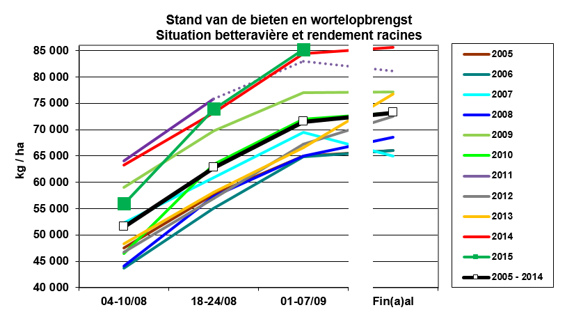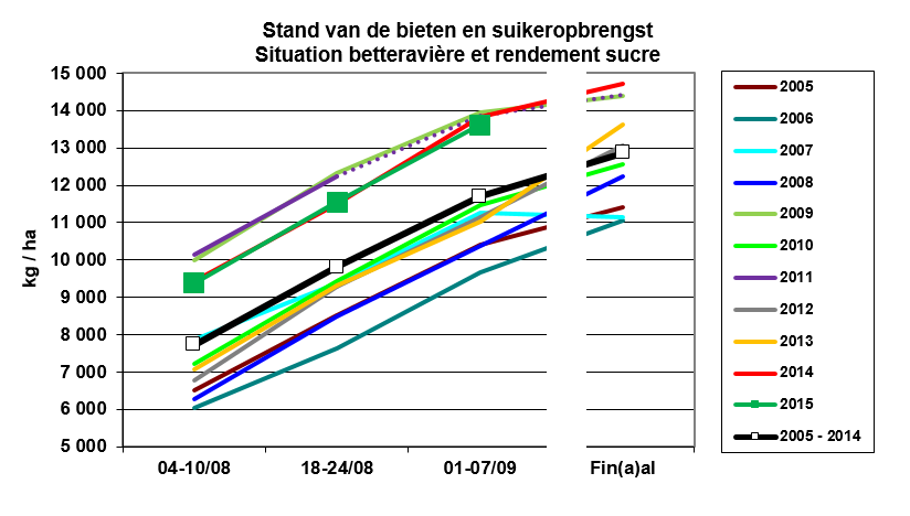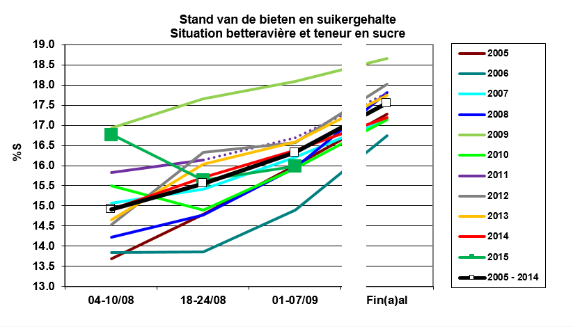 Les résultats des prélèvements effectués par les sucreries au 7 septembre montrent un rendement en sucre actuellement de ± 13,6 t/ha. Il était de 13,8 t/ha en 2014 et proche de 14,0 t/ha en 2009 à la même période. Le rendement sucre actuel est supérieur de 2 t/ha par rapport à la moyenne des 10 dernières années (les résultats complets).