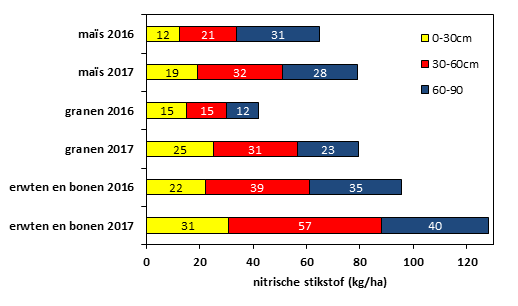 Na maïs bedraagt de N-reserve gemiddeld 15 kg N/ha meer dan vorig jaar. Zowel na de vlinderbloemige voorteelten, erwten en bonen als na de meest voorkomende voorteelt granen bedraagt het verschil ten opzichte van vorig jaar gemiddeld meer dan 30 kg N/ha. De bovenste bodemlaag bevat gemiddeld 7 à 10 kg N/ha meer dan vorig jaar. De tweede bodemlaag van 30-60 cm welke ook zeer efficiënt benut wordt door de bieten is dit jaar uitgesproken de stikstofrijkste bodemlaag.