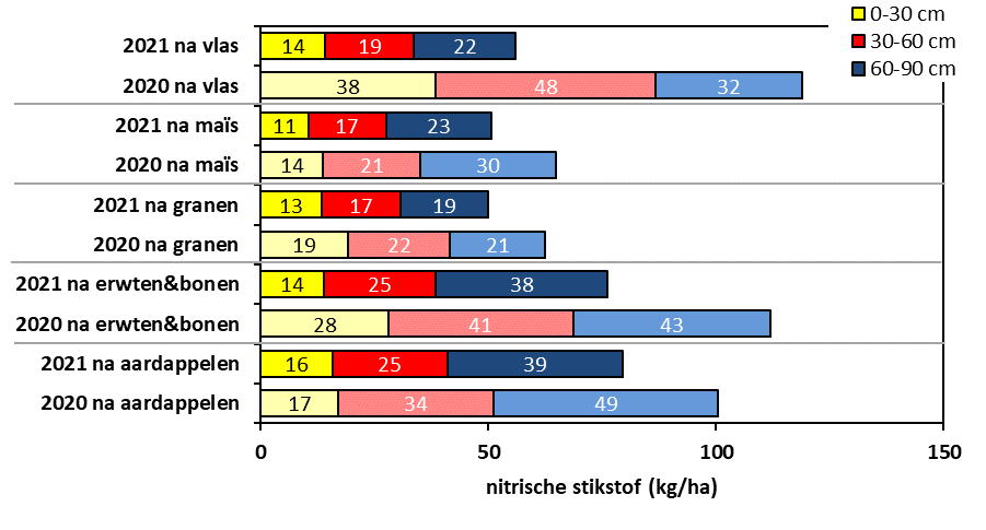 Na maïs bedraagt de N-reserve gemiddeld 14 kg N/ha minder dan vorig jaar. Na de vlinderbloemige voorteelten, erwten en bonen bedraagt het verschil gemiddeld 36 kg N/ha en na de meest voorkomende voorteelt granen 13 kg N/ha. De bovenste bodemlaag bevat gemiddeld weinig minerale N. Voor de voorteelten aardappelen, erwten en bonen en maïs is de derde bodemlaag van 60-90 cm de stikstofrijkste bodemlaag. Na granen en vlas zit de meeste stikstof in de tweede bodemlaag van 30-60 cm.