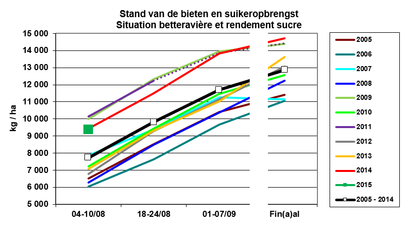 De resultaten van de eerste bemonstering van de suikerfabrieken op 10 augustus geven een suikeropbrengst die momenteel ± 9,4 t/ha bedraagt. Deze lag rond 10 t/ha in 2009 en 2011, maar slechts op 7,1 t/ha in 2013 in dezelfde periode. De suikeropbrengst is 1,6 t.ha hoger dan de gemiddelde opbrengst van de laatste 10 jaar (7,7 t/ha), en 1,2 t/ha hoger dan de gemiddelde suikeropbrengst van de laatste 5 jaar (8,1 t/ha) (volledige resultaten).