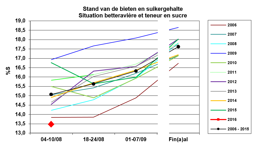 Deze suikeropbrengst is voornamelijk het resultaat van een laag suikergehalte van 13,5°S, maar ook van een laag wortelgewicht van 49,2 t/ha. Deze cijfers zijn 1,9°S en 6,5 ton wortels lager dan de gemiddelden van de laatste 5 jaar (15,35°S en 55,6 t/ha). Het gemeten suikergehalte in 2016 is het laagste van de laatste 10 jaar.