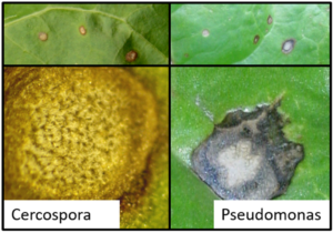 Cercospora: In een vroeg stadium: kleine, ronde, grijsachtige vlekken met een donkerbruine tot violet-rode goed afgelijnde rand met in het midden kleine (vergrootglas) zwarte puntjes (sporendragers) met daarop fijne witte haartjes.